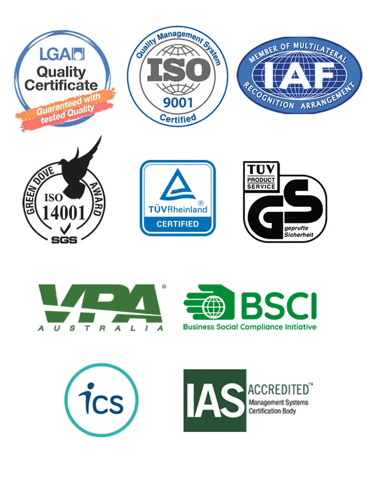 Leeyoung® products are backed by internationally recognized certifications, including BSCI, VPA, ISO9001, ISO14001, TUV, TUV-GS, IAF, and IAS — ensuring quality, safety, and reliability you can trust.